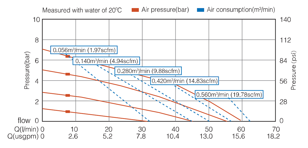 | Max. Elevador de succión La altura de succión cambia con las diferentes combinaciones de materiales de bola, asiento y diafragma. | Seco 4m Mojado 7,6m |