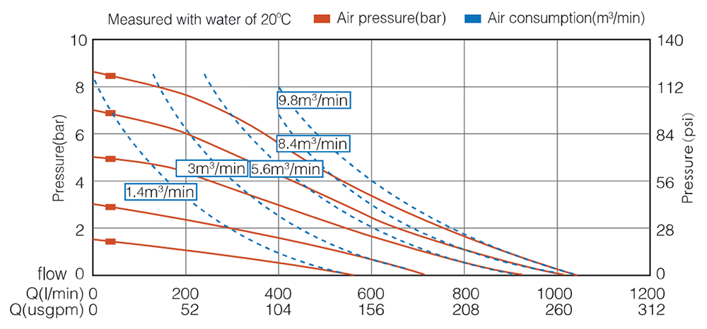 | Max. Elevador de succión La altura de succión cambia con las diferentes combinaciones de materiales de bola, asiento y diafragma. | Seco 5m Mojado 8m |