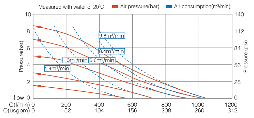 | Max. Elevador de succión La altura de succión cambia con las diferentes combinaciones de materiales de bola, asiento y diafragma. | Seco 5m Mojado 8m |