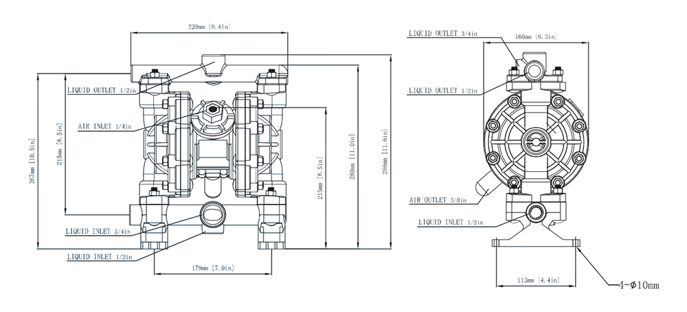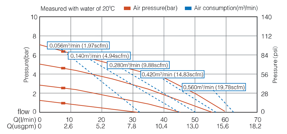 | Max. Elevador de succión La altura de succión cambia con las diferentes combinaciones de materiales de bola, asiento y diafragma. | Seco 4m Mojado 7,6m |