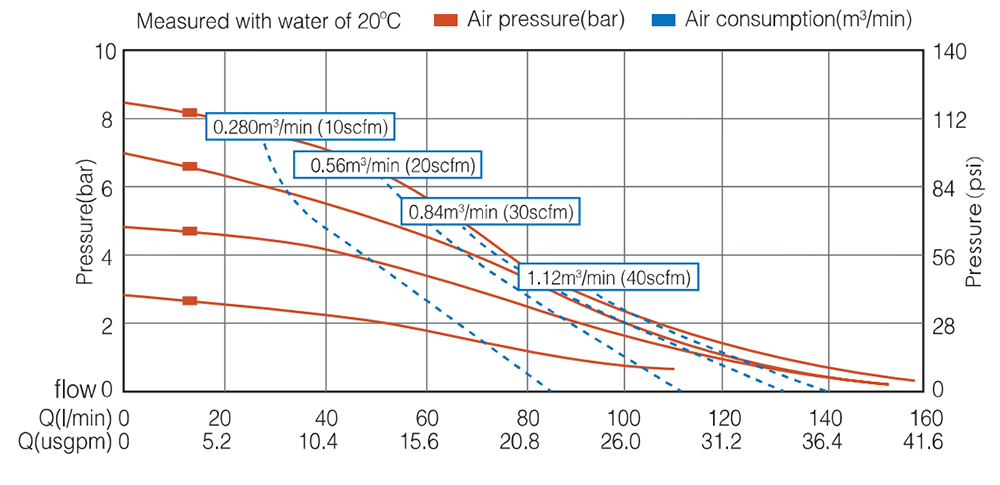 | Max. Elevador de succión La altura de succión cambia con las diferentes combinaciones de materiales de bola, asiento y diafragma. | Seco 4m Mojado 8m |