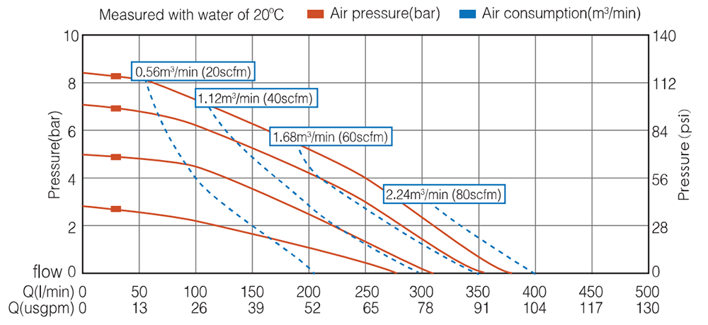 | Max. Elevador de succión La altura de succión cambia con las diferentes combinaciones de materiales de bola, asiento y diafragma. | Seco 5m Mojado 8m |