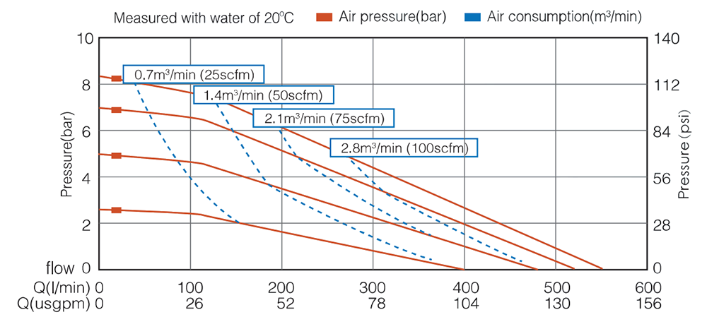 | Max. Elevador de succión La altura de succión cambia con las diferentes combinaciones de materiales de bola, asiento y diafragma. | Seco 5m Mojado 8m |